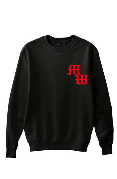 Black sweatshirt with MW left chest print and big MWUANA top rocker print on back in red.